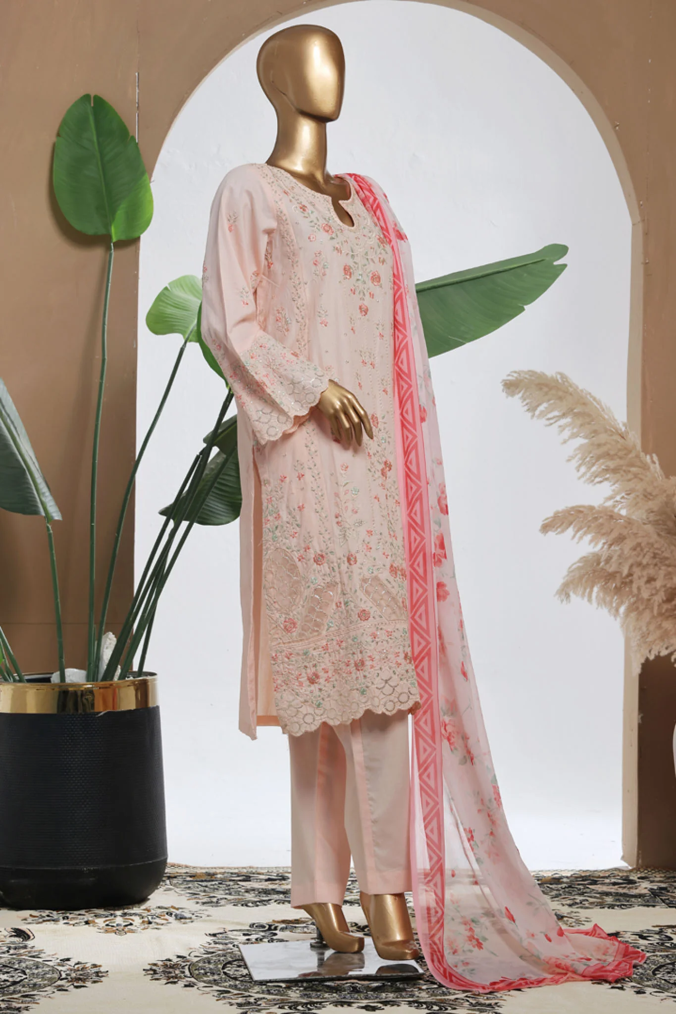 Bin Saeed Stitched 3 Piece Luxury Plain Cotton With Chiffon Dupatta Suit-SMPC-2068-Pink