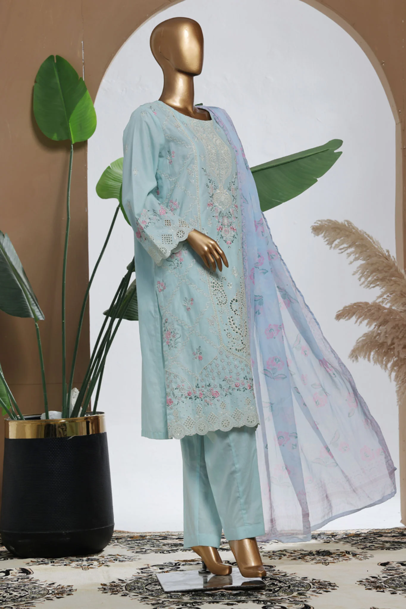 Bin Saeed Stitched 3 Piece Luxury Plain Cotton With Chiffon Dupatta Suit-SMPC-2069-Sky Blue