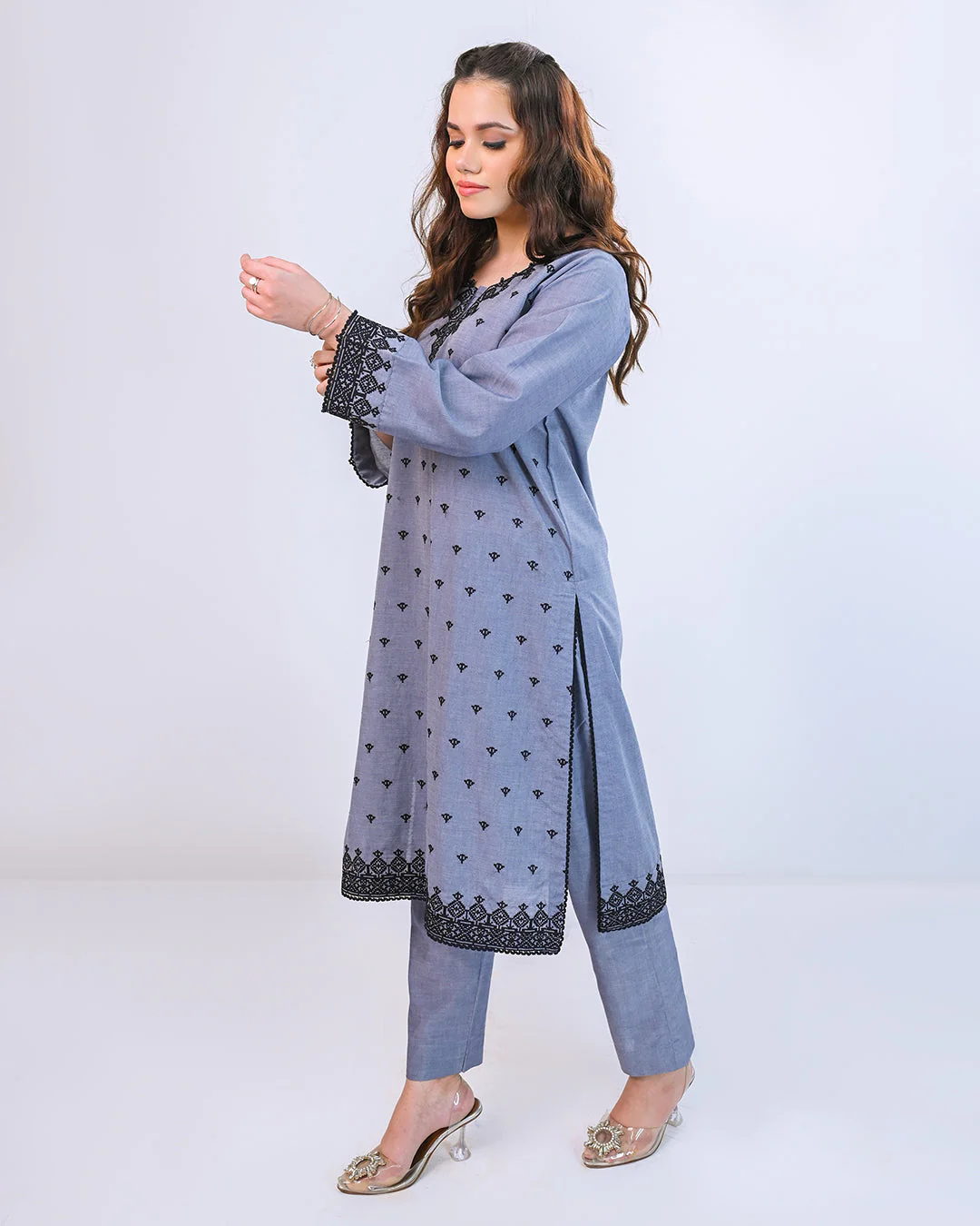 Classic grey and black combination with intricate cross-stitch embroideryâ€â€perfect for any day or night event!