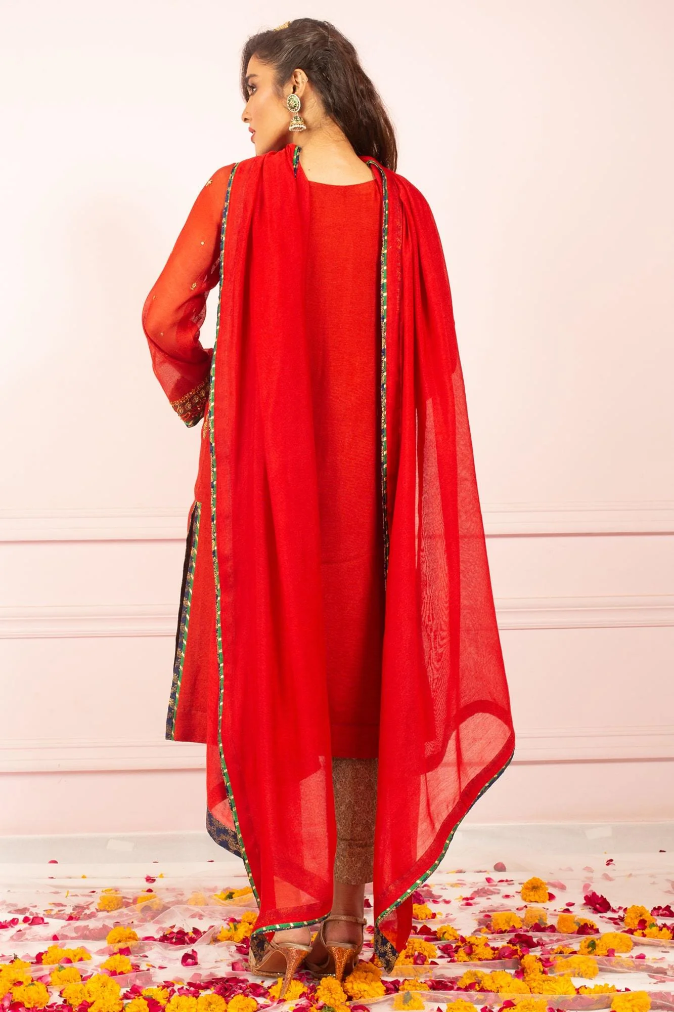 ?Laali? is meticulously hand worked shirt in glimmering gold and copper on red khaddi net delicately embellished with kora, dabka and resham. It is accentuated with banarsi finishing in an accent color.Â